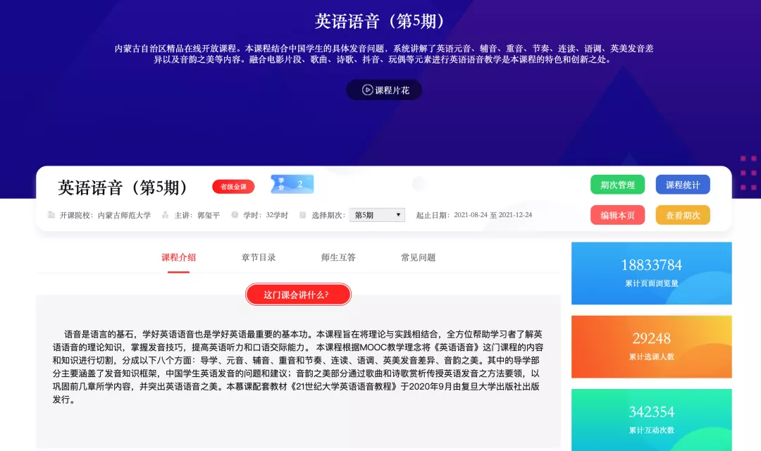 本课程于2019年9月在超星公司学银在线平台上线,现已运行至第5期,截至目前,来自全国1000多所学校的学生和社会各界的英语爱好者近3万余名学员注册学习该课程,累计页面浏览量近2千万次,互动次数34万余次。此外,本课程还在学习强国和中国高校外语慕课联盟(UMOOCs)另外两个平台同时运行。2021年7月,本课程被认定为自治区级一流线上课程。