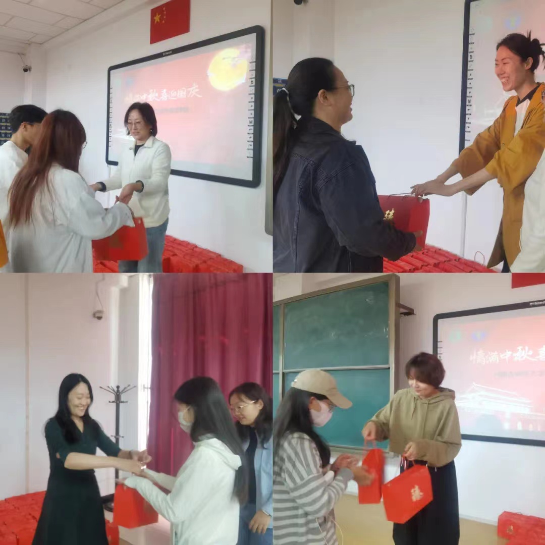 赵晓军院长亲切问候在校学生,向大家致以节日的问候和诚挚的祝福,她嘱咐同学们合理规划假期生活、注意安全、快乐的度过双节。老师们为每一位学生送上中秋的祝福和学院精心准备的月饼和水果。月饼虽小,却蕴含着浓浓亲情和暖暖爱意,承载着学院对学生们的关切和期望。同学们纷纷表示感谢学院传递的温暖和关怀,将珍惜在校园的时光,不断努力学习。
