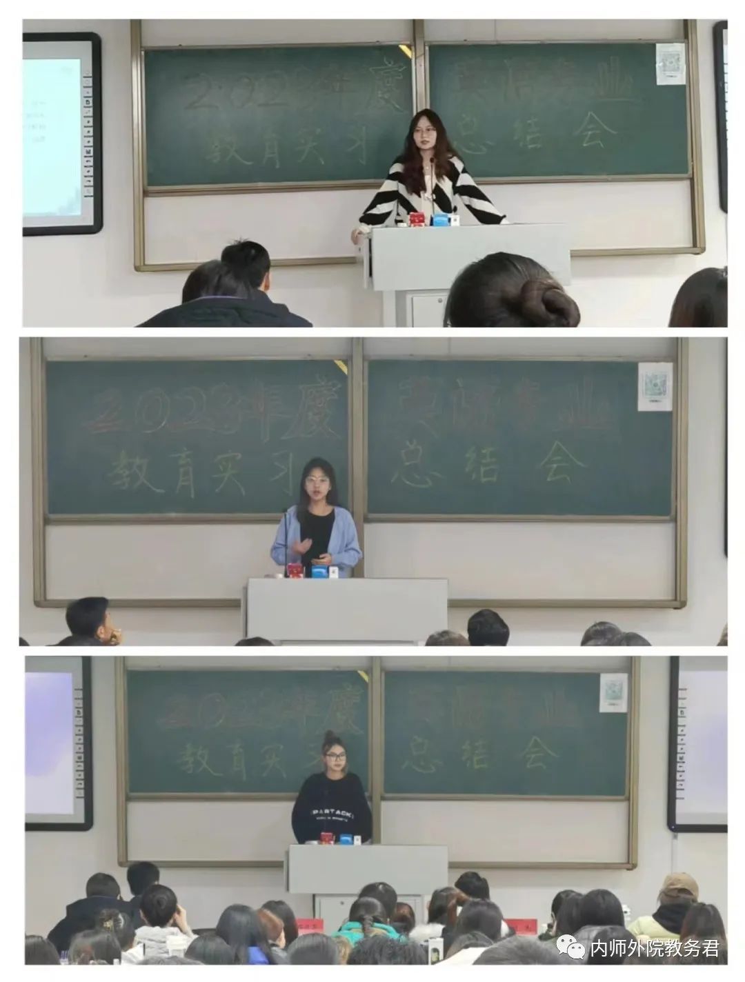 本次实习总结大会还邀请20级2班杭运飞、20级4班白如雪、20级蒙英班苏叶作为实习生代表分享了自己的实习心得体会。三位实习生代表从实际教学、班级管理、师生关系等多方面分享了自己的实习经验和实习感悟,展示了丰富多彩的实习生活,以及如何通过总结反思和不断改进来提高实习质量的方法,让在场的21级准实习生们受益良多。