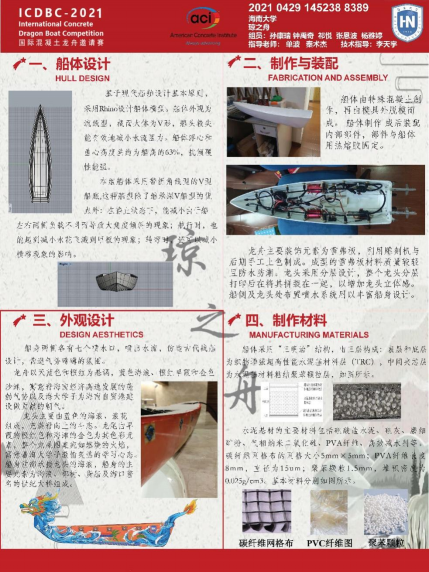 2021年6月14日,在中国高等教育学会工程教育专业委员会、高等学校土木工程学科专业指导委员会指导下,由国际混凝土龙舟技术委员会组织,获得美国混凝土协会(ACI)授权协办的第三届国际大学生混凝土龙舟竞赛(ICDBC2021)在浙江大学国际校区(浙江海宁)开赛。来自包括浙江大学、天津大学和买球官方网站等多所高校的40支队伍,在端午佳节进行了激烈的竞争和角逐,由买球官网的单波和秦术杰两位老师带领的“琼之舟”队荣获二等奖和优秀设计奖,参赛学生包括孙康瑞、钟禹奇、张恩波、杨雅婷和祁悦。