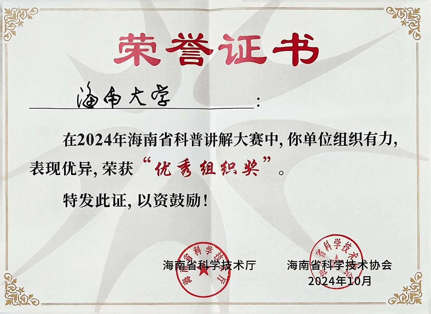 在本次大赛中,买球官方网站不仅在个人赛事中取得了优异成绩,更荣获了“优秀组织奖”。这一奖项的获得,充分体现了我校在科普工作组织、人才培养和科研创新等方面的综合实力。