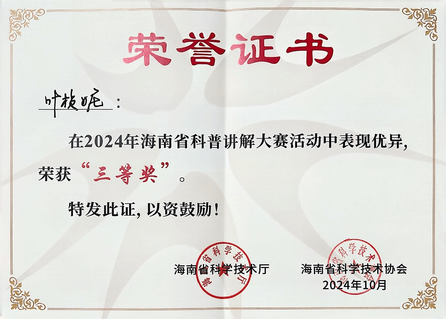 在刚刚落幕的2024年海南省科普讲解大赛中,买球官方网站土木与建筑工程学院叶桢妮副教授以出色的表现获得三等奖,为我校争得了荣誉。本次大赛以“弘扬科学家精神 激发全社会创新活力”为主题,吸引了全省各行各业的143名选手参与。海南省科普讲解大赛是全省科普工作者沟通交流、展示风采的重要平台,也是海南科普活动的一张亮丽名片。自2015年以来,大赛已成功举办十届,参与人数持续上升,活动形式不断创新,活动层次不断提高,已成为目前全省范围最大、水平最高、代表性最强的科普讲解竞赛。