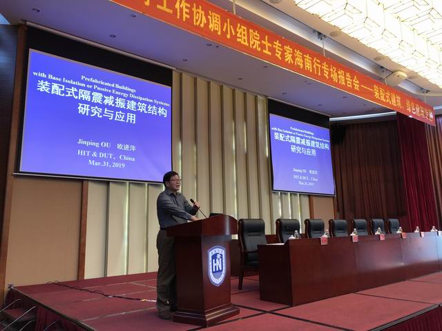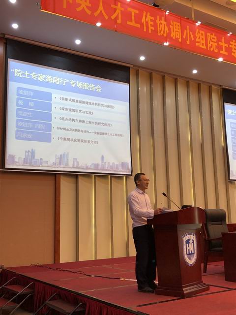 欧进萍院士分别作了“装配式隔震减振建筑结构研究与应用”和“FRP制品及其构件与结构——一类新型海洋土木工程结构”两个主题报告。结合海南地域特征和团队研究优势,欧院士从超大位移隔震支座、承载-消能钢质构件、被动自适应消能构件及其装配式建筑结构体系,以及FRP材料性能、组合产品及其在大型复杂工程中的应用等各方面,深入浅出地作了精彩报告。