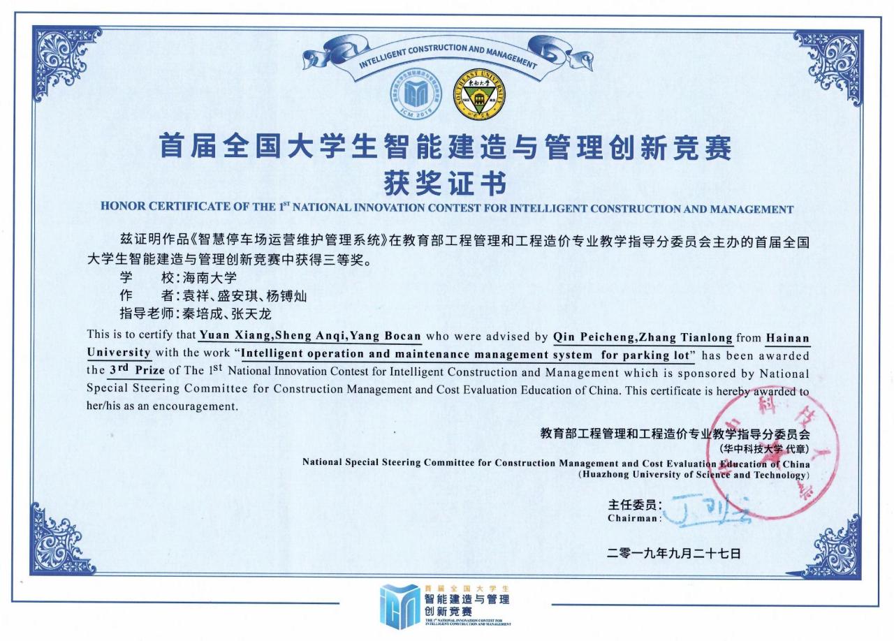 首届全国大学生智能建造与管理创新竞赛于2019年9月14日至9月15日在东南大学举办,买球官网和计算机与网络空间安全学院跨学科跨专业联合组队,经过提交作品、现场答辩和专家评审等环节代表队荣获三等奖。参赛学生队员分别为2016级工程管理专业袁祥、盛安琪同学及2016级计算机科学与技术专业杨镈灿同学,指导教师为买球官方网站工程管理系秦培成老师和张天龙老师。