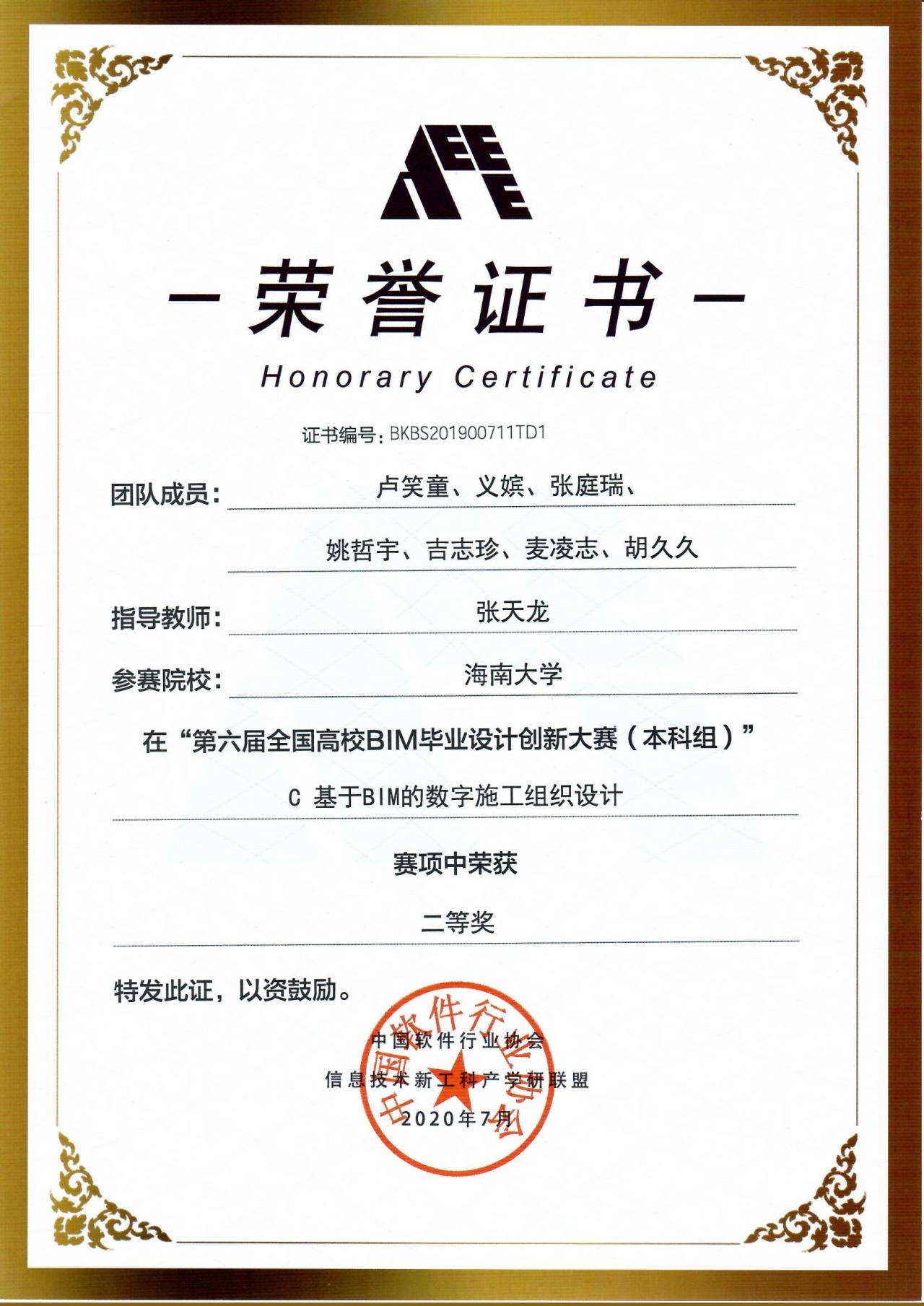 2020年6月16日,第六届全国高校BIM毕业设计创新大赛评选结果揭晓。由买球官方网站工程管理系张天龙老师指导,工程管理2016级毕业生卢笑童、义嫔、张庭瑞、姚哲宇、吉志珍、胡久久、麦凌志、陈浩等组成的参赛团队在“基于BIM的数字施工组织设计”模块中斩获二等奖。