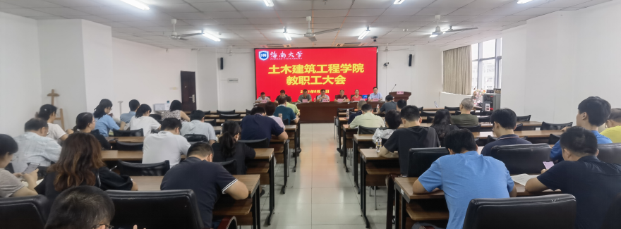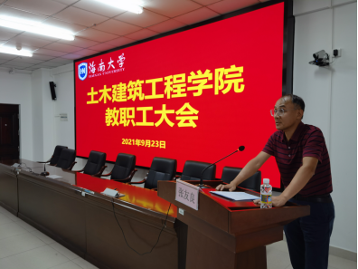 2021年9月23日下午,土木建筑工程学院新学期教职工会议在研发楼510报告厅召开。学院党政领导班子、党委委员、系主任、实验教学中心负责人、支部书记、科室管理职员和全体教师等参加会议。此次会议旨在传达学校暑期工作会议精神,增强学院教师对学校发展状态、战略方向和改革政策的了解,深入理解学院下一步发展方向、路径和举措,进一步凝聚共识、形成合力,为学院“开启新征程、奋进一流学科”开好局、起好步。会议由学院党委书记卢江海主持。