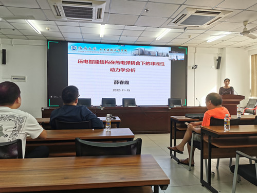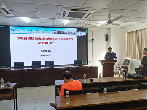 学术报告主要聚焦压电智能结构在热电弹耦合下的非线性动力学分析,首先介绍了压电矩形薄板结构在热电弹耦合下的非线性主共振和混沌振动问题,根据广义Hamilton原理、Rayleigh-Ritz法和Von-Karman大挠度理论,得到了压电矩形薄板的非线性振动控制方程。利用谐波平衡法进行一阶近似响应分析,得到相应的幅频方程,进一步分析了温度、阻尼、板厚、激励电荷以及模态参数变化对主共振响应的影响规律。最后讲解了利用哈密顿原理,引入欧拉方程,研究了温度效应下无限长压电圆杆纵向孤波问题,分别利用Jacobi椭圆余弦函数和正弦函数求解了压电圆杆的波动方程,得到了其孤立波解。讨论了温度场对压电圆杆波形、幅值和波数的影响曲线。报告结束后,薛春霞教授就师生感兴趣的问题进行了解答。