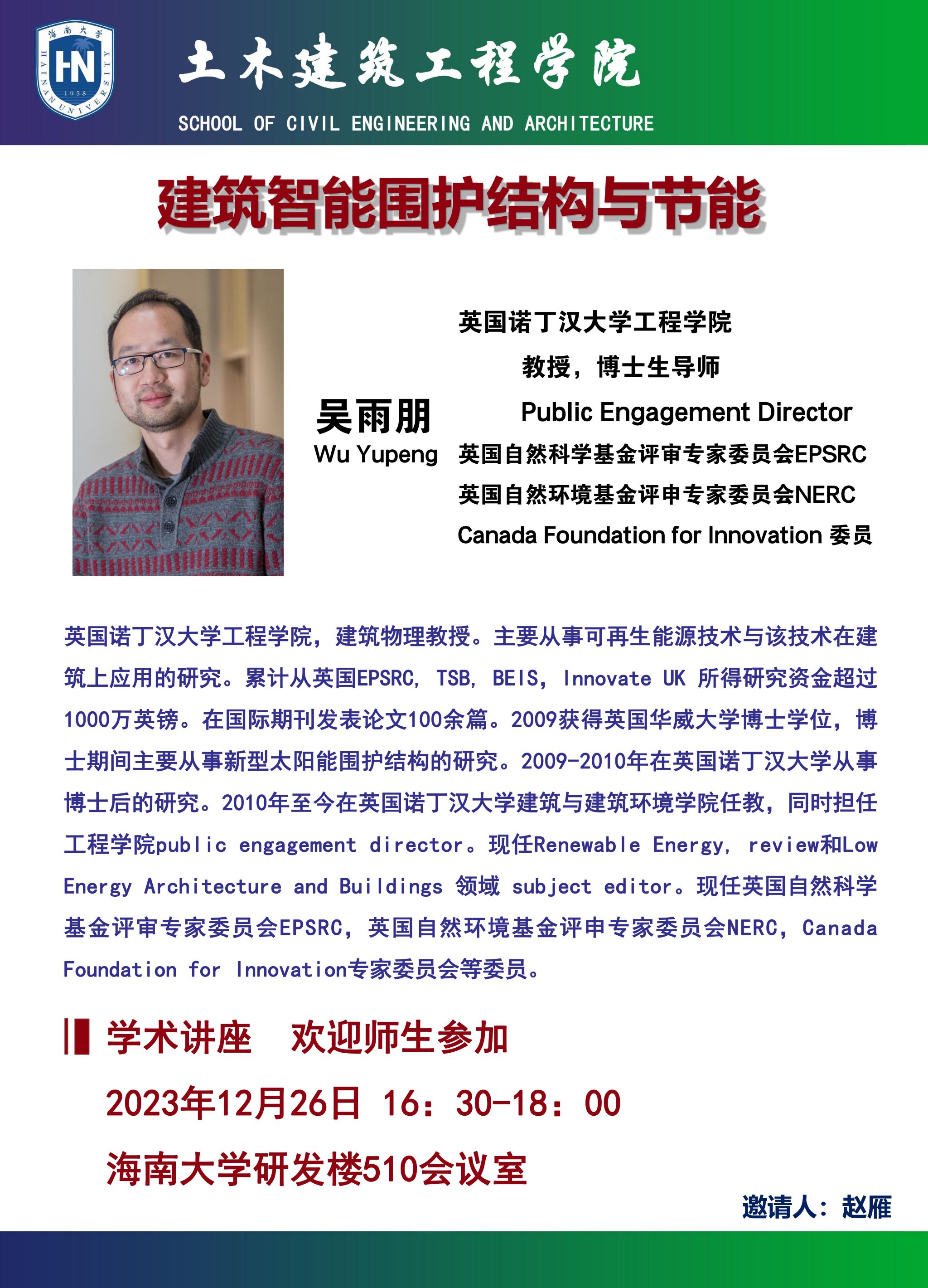 1226日(周二)16:30-1800在买球官方网站研发楼510会议室,英国诺丁汉大学工程学院教授,博士生导师 Public Engagement Director(英国自然科学基金评审专家委员会EPSRC、英国自然环境基金评申专家委员会NERC、Canada Foundation for Innovation 委员),在买球官网做建筑智能围护结构与节能》学术报告。欢迎有兴趣的师生参加。