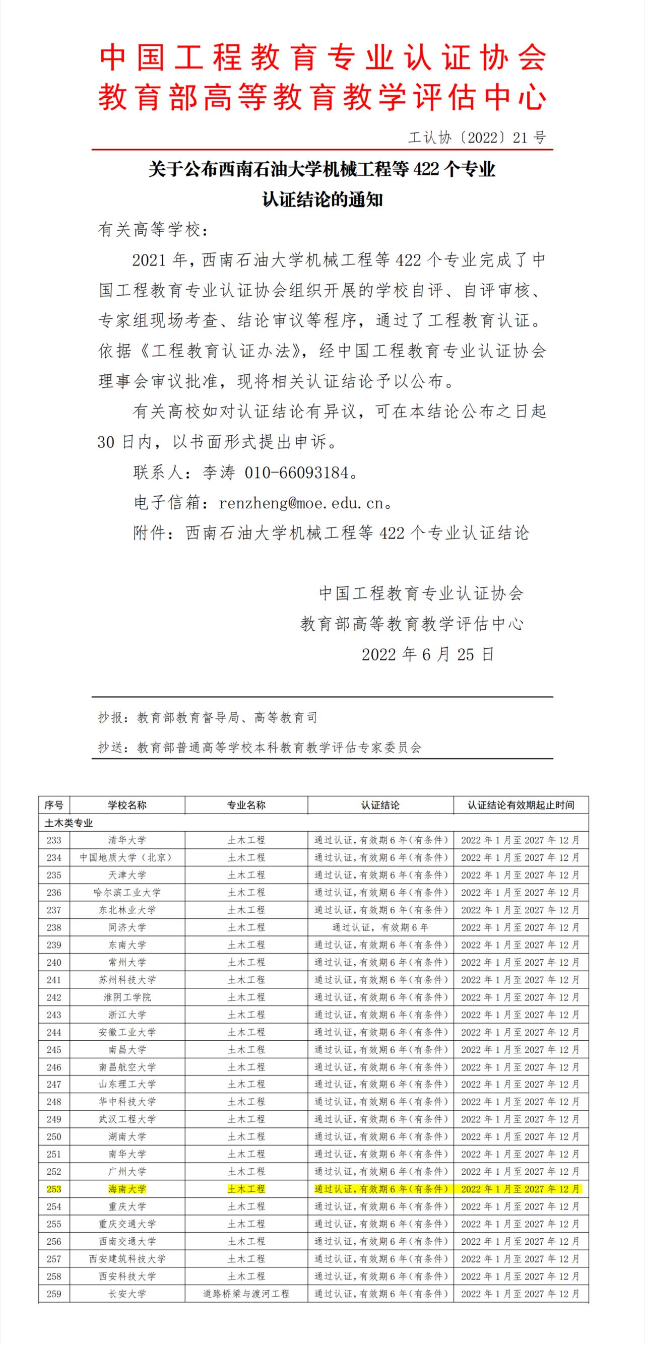 20226月25日,中国工程教育专业认证协会、教育部高等教育教学评估中心发布《关于公布西南石油大学机械工程等422个专业认证结论的通知》(工认协[2022]21号)。买球官方网站土木工程专业顺利通过工程教育认证,认证结论为“通过认证,有效期6年(有条件)”,认证结论有效期起止时间为20221月至202712月。同时通过认证的有清华大学、同济大学和浙江大学等26所高校的土木工程专业。据悉,该名单还将提交至国际工程教育《华盛顿协议》组织。