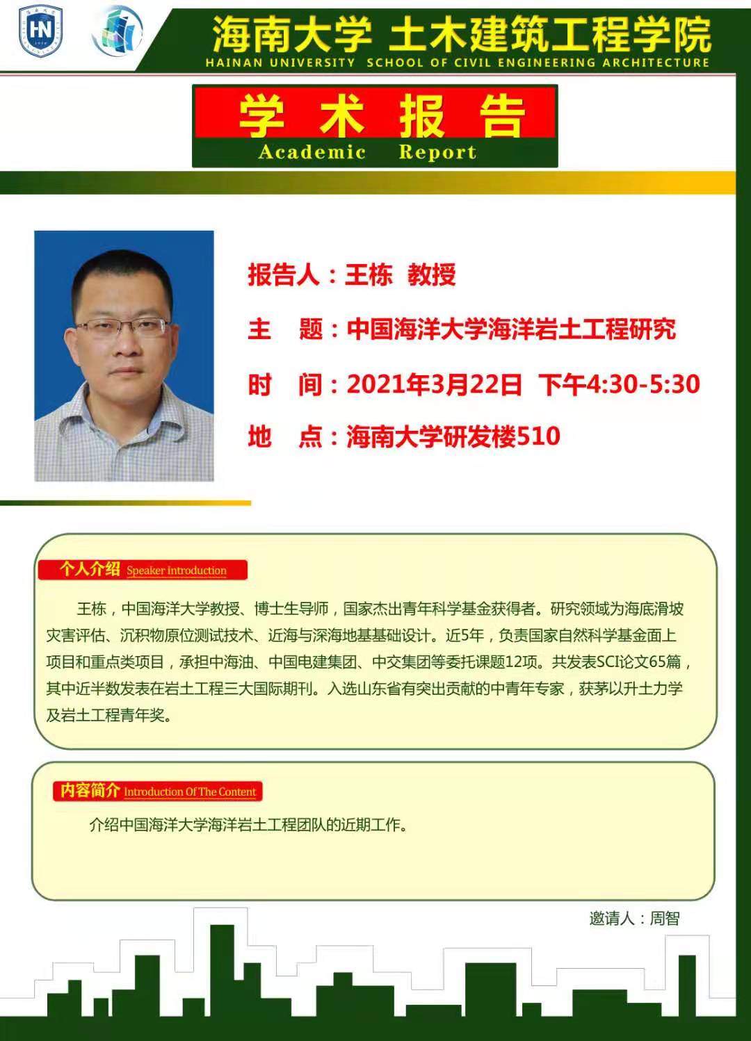 3月22日(周一)下午4:00-5:30点在买球官方网站研发楼510,中国科学院武汉岩土力学研究所,博士生导师汪稔研究员和中国海洋大学王栋教授分别在买球官网做题为《岛礁建设对“一带一路”倡议的贡献》和《中国海洋大学海洋岩土工程研究》。请有兴趣的老师和没有课的研究生务必参加,到时会做参会签名,考勤记录。特此通知 学科与科研办 2021年 3月21日