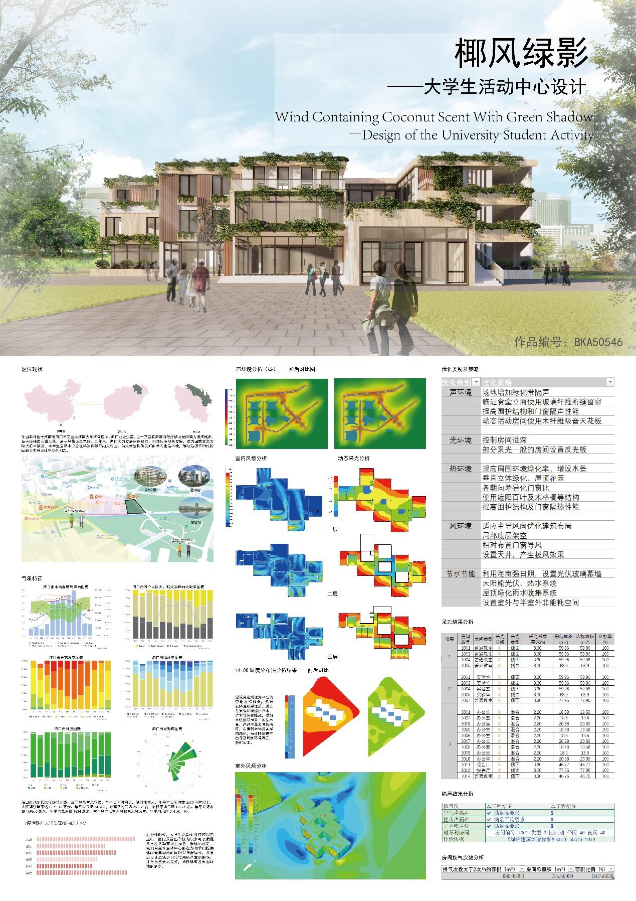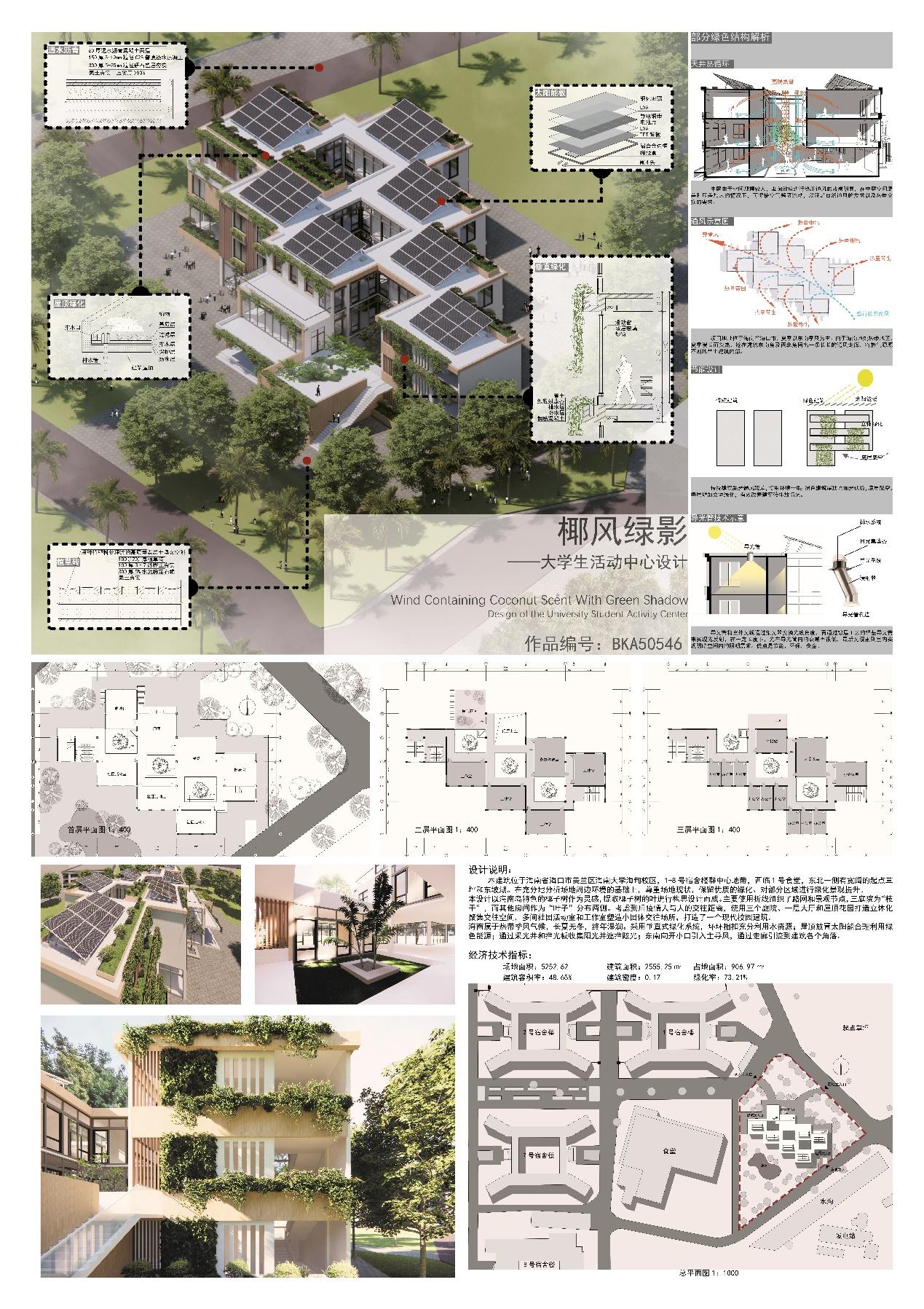 优秀作品奖是椰风绿影——大学生活动中心设计,本建筑位于海南省海口市美兰区买球官方网站海甸校区,1-8号宿舍楼群中心地带,西临1号食堂,东北一侧有宽阔的起点草坪和东坡湖。在充分地分析场地周边环境的基础上,尊重场地现状,保留优质的绿化、对部分区域进行绿化景观提升。